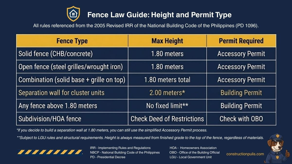 The NBCP and its IRR do not present fence rules in a single section or numbered list. They are scattered across different parts of the 2005 Revised IRR — Rule III, Rule VII, Rule VIII, and Rule X. The six rules in this Dispatch are Construction Pulis’s own summary, organized in a way that’s easier for homeowners to follow. The actual IRR text is included with each rule so you can verify the source yourself.